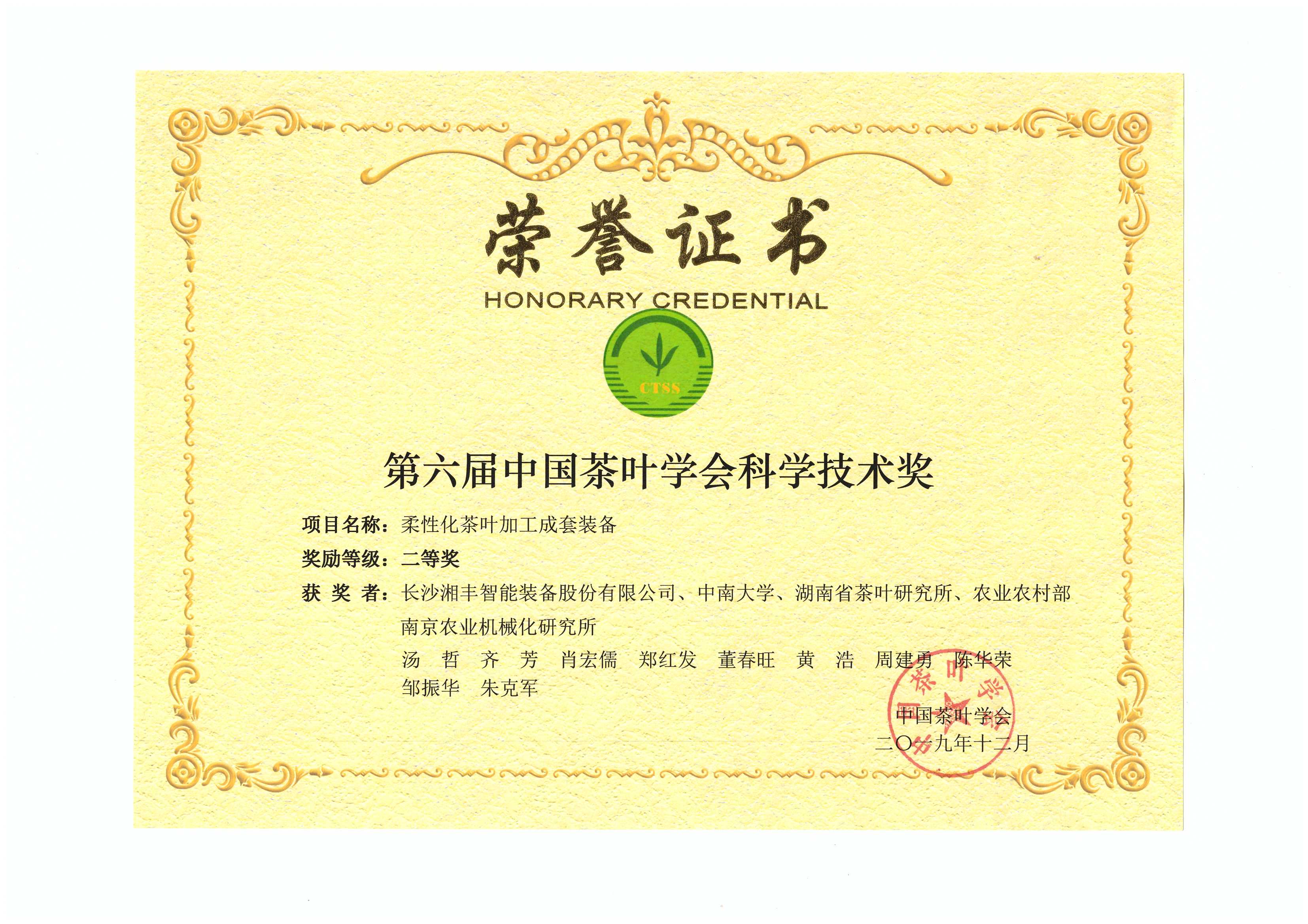 我司“柔性化茶葉加工成套裝備”榮獲“第六屆中國(guó)茶葉學(xué)會(huì)科學(xué)技術(shù)獎(jiǎng)”
