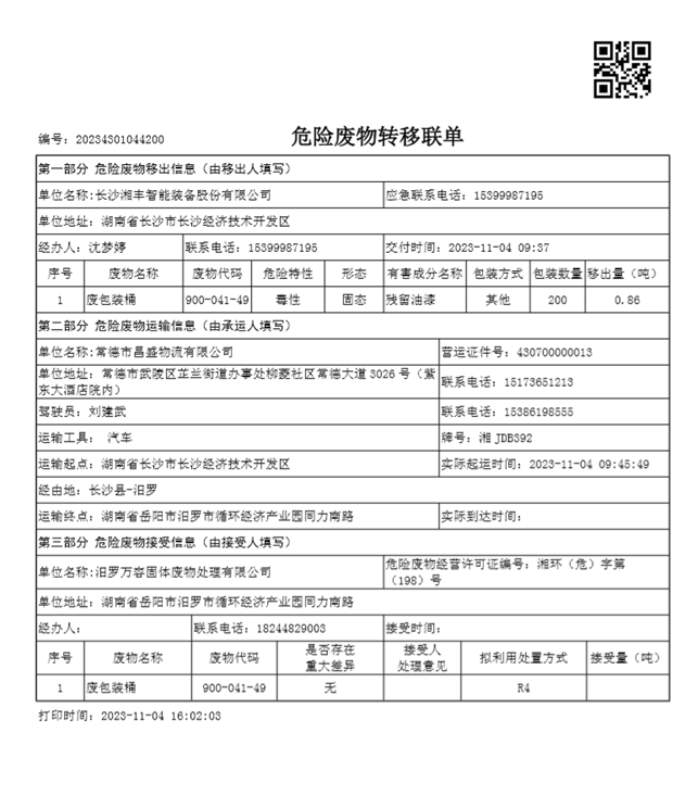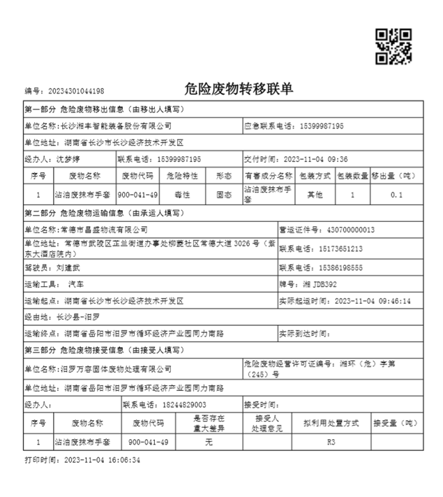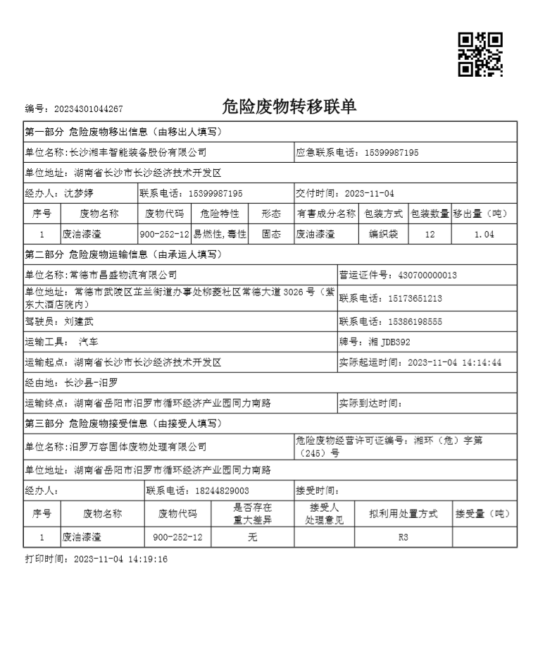 長沙湘豐智能裝備股份有限公司2023年度危廢轉移公示