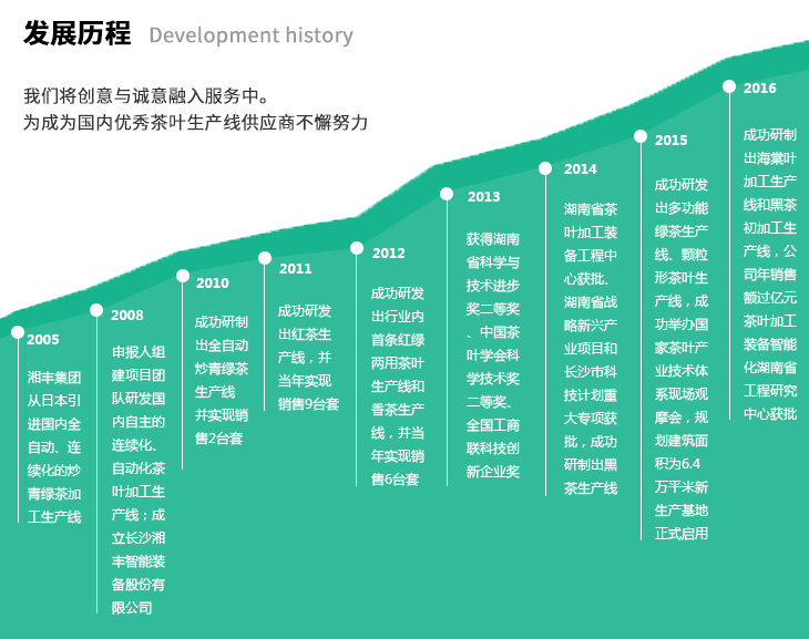 長沙湘豐智能裝備股份有限公司成立于2005年,是一家專業從事茶葉加工裝備研發和制造的高新技術企業,具有較強的茶葉裝備行業生產技術和研發力量。公司定位于用工業化思路解決農業生產問題,致力于打造智能化高端茶葉裝備。
